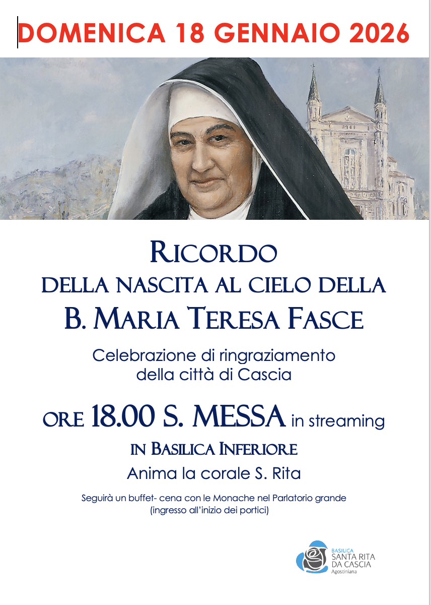 Il 18 gennaio è una data profondamente significativa per la città di Cascia e per quanti guardano alla testimonianza delle grandi figure di santità nate e cresciute all’ombra del Monastero di Santa Rita. In questo giorno la comunità ecclesiale e civile si stringe nel ricordo della nascita al cielo della Beata Maria Teresa Fasce, avvenuta nel 1947, rendendo grazie per una vita interamente donata a Dio e al bene della Chiesa.