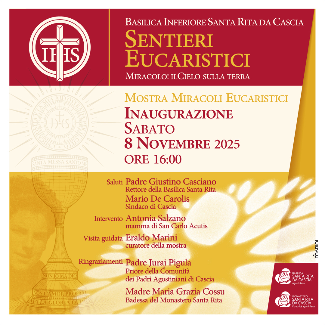 Dall’8 novembre 2025, la Basilica inferiore di Santa Rita da Cascia ospita la mostra “Sentieri Eucaristici. Miracolo! Il cielo sulla terra”, la prima esposizione interamente dedicata a San Carlo Acutis dopo la sua canonizzazione.
