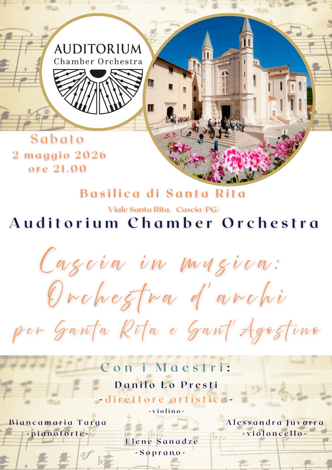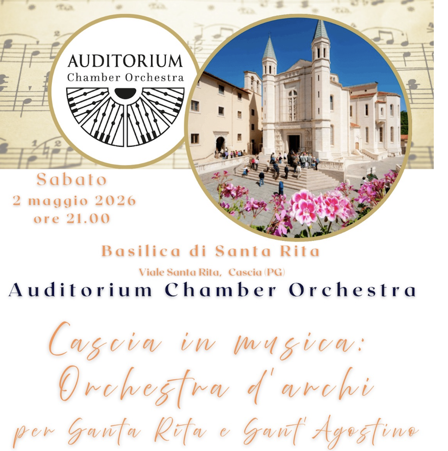 Sabato 2 maggio 2026 alle ore 21.00, la Basilica di Santa Rita a Cascia ospiterà un evento musicale di grande suggestione: “Cascia in musica: Orchestra d’archi per Santa Rita e Sant’Agostino”, con protagonista l’Auditorium Chamber Orchestra.